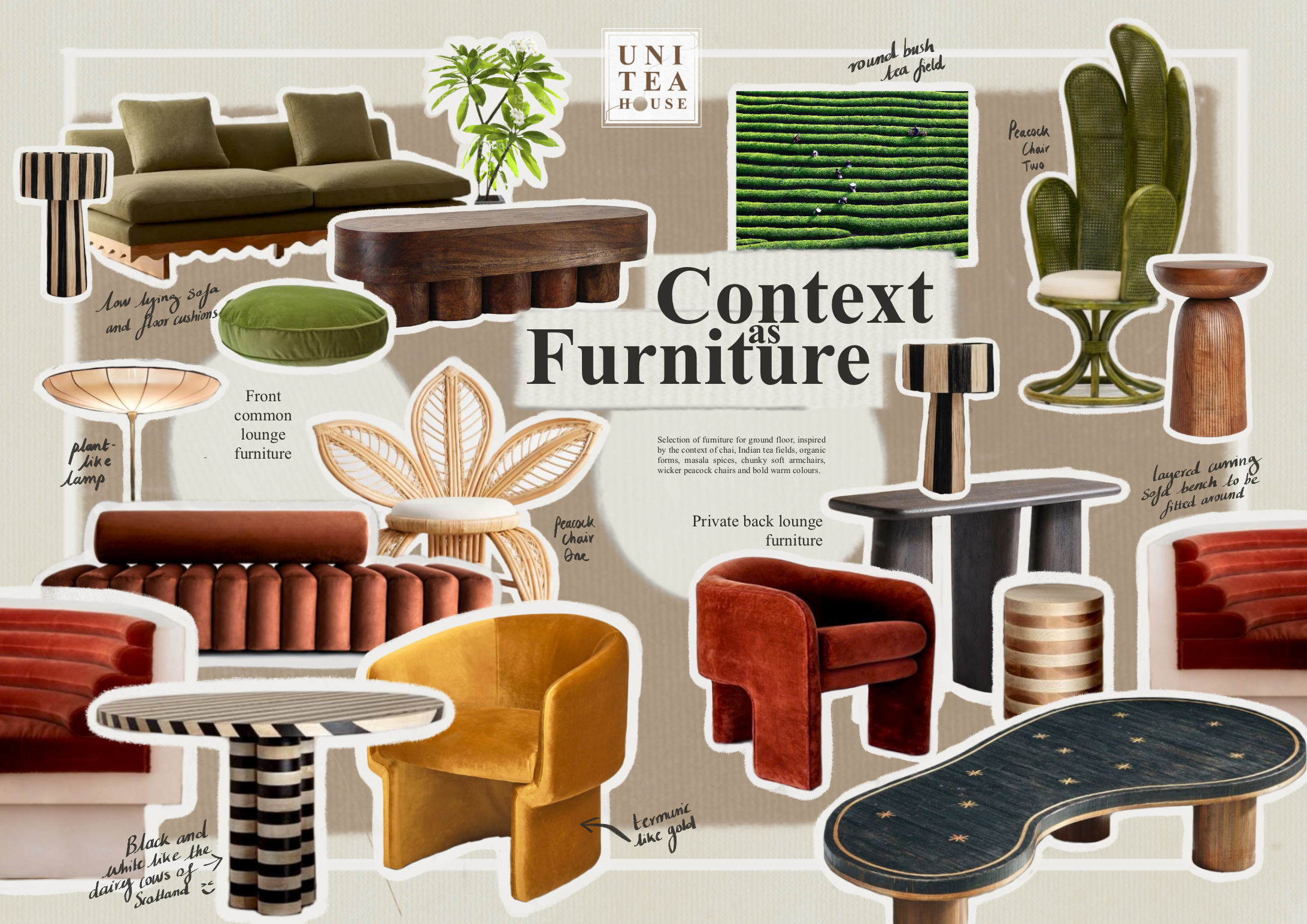 Each ingredient; its distinct colours, textures and taste is explored in the design process, lending to materiality and colour choice.